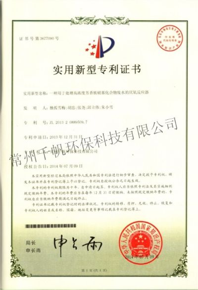 實(shí)用新型專利證書(shū) 一種用于處理高濃度芳香族硝基化合物廢水的厭氧反應(yīng)器