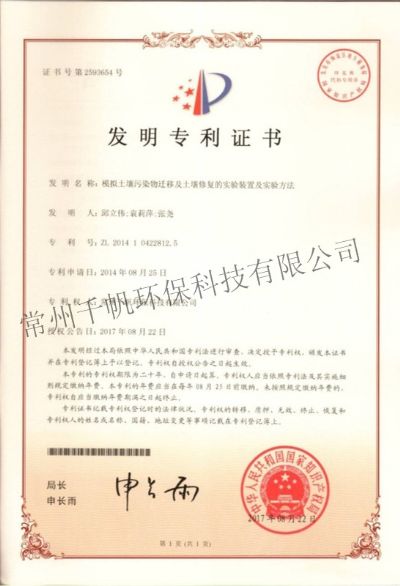 發(fā)明專利證書(shū) 模擬土壤污染物遷移及土壤修復(fù)的實(shí)驗(yàn)裝置及實(shí)驗(yàn)方法
