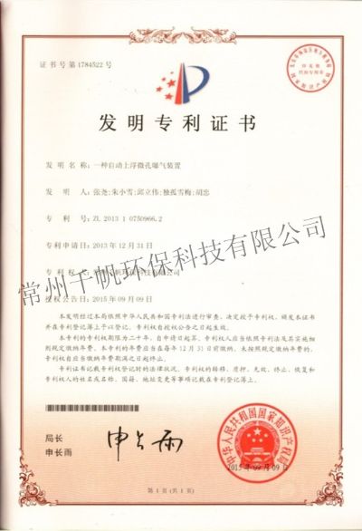 發(fā)明專利證書(shū) 一種自動(dòng)上浮微孔曝氣裝置