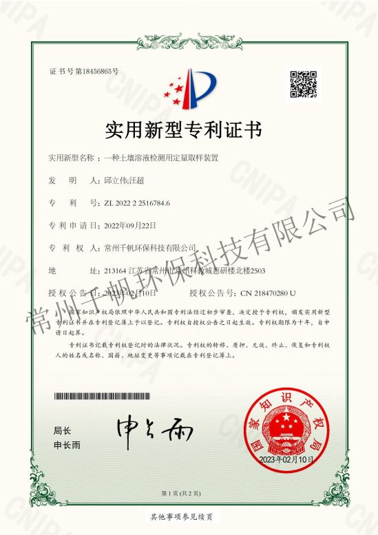實(shí)用新型專利證書(shū) 一種土壤溶液檢測(cè)用定量取樣裝置